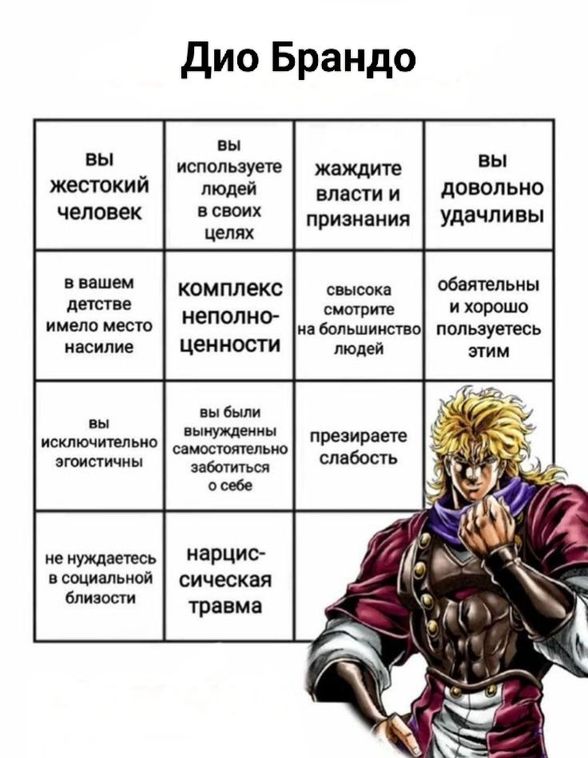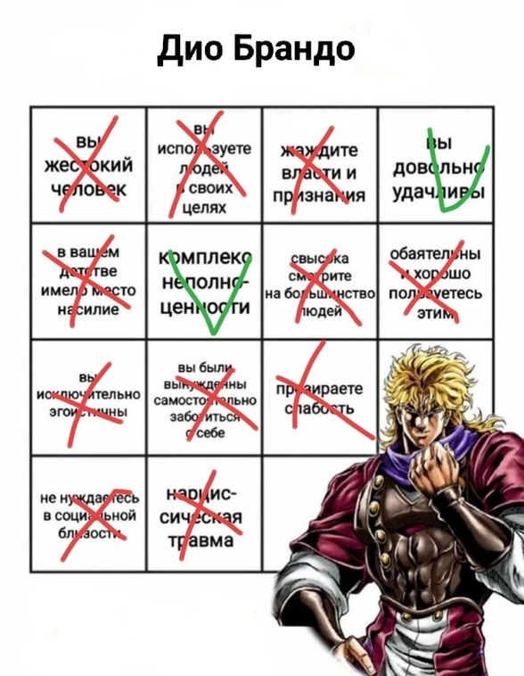 Насколько вы похожи на Дио Брандо❓Для ответа на вопрос нужно заполнить бинго:Если ,вы обладает данным качеством ставите✅, если нет ставите ❌. Так же можете написать в комментарии сколько пунктов совпадаютВот мой вариант:2/13 я доволен результатомP. S.- Стоит ли продолжать эту рубрику?#СтражиРазрушенногоМира#Yuu1ch1