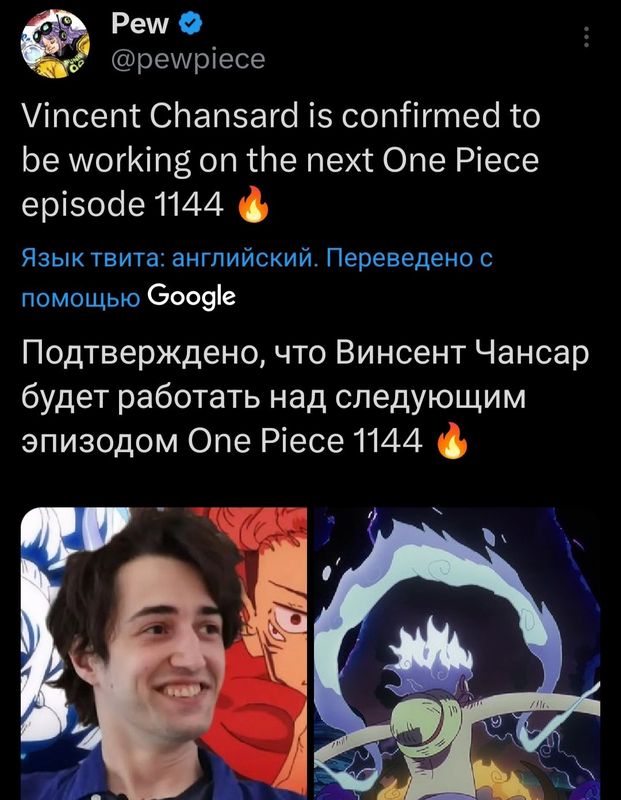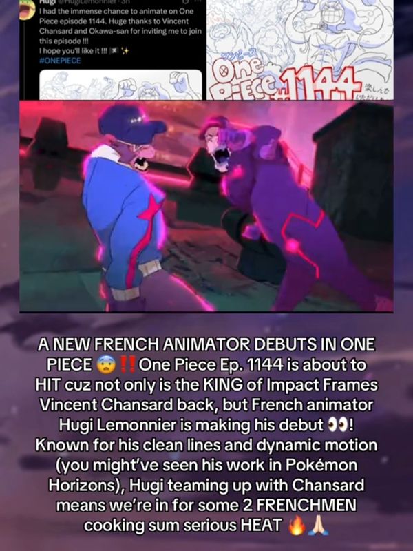 Немного можно и пояснить:1. Все предрелизные кадры имбища, такого я вообще за всю историю тизеров вп не помню.2. Тандем Винсента Чансарда и ещё одного Французского аниматора. Почему это должно зарешать? Винсент один из лучших аниматоров в индустрии, половина анимированной имбы в ван писе это его рук дело, из-за него даже стали использовать слово "Переанимированные аниме-сцены", настолько он хорош. Во-вторых второй аниматор тоже из франции как и Винсент и я уверен это как-то помогло им вместе реализовать кучу идей при работе над серией.