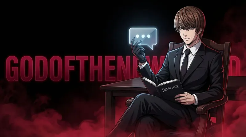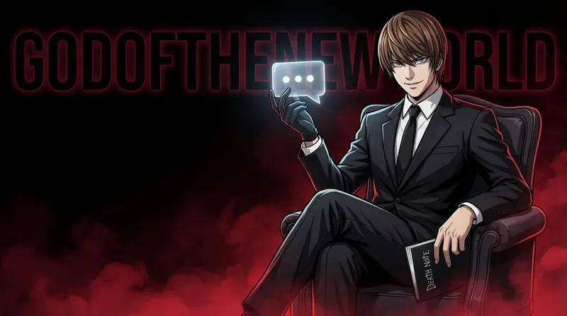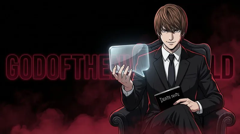 Create a YouTube thumbnail in a clean, high-contrast, professional anime style featuring Yagami Light from Death Note with accurate anime appearance, wearing a black elegant suit and sitting confidently on a chair, upper body visible and slightly angled toward the camera. He has a cunning, confident smirk and cold, intelligent eyes. He is sitting on a chair with a table behind him; in one hand he holds a modern transparent glass comment icon (UI-style speech bubble, glossy, slightly glowing), and in the other hand he holds the Death Note notebook, clearly recognizable. Both objects must be clearly visible and readable. The character is placed on the right side of the frame with large empty space on the left for text. Camera angle slightly below eye level to give a dominant presence, upper-body framing. Dramatic cinematic lighting with strong contrast, subtle red rim light from below, soft highlights on the glass icon, clean shadows, no overexposure. Deep black background with red smoky fog spreading along the ground, subtle volumetric smoke, minimal but atmospheric. Behind the character, large bold background text: “GodOfTheNewWorld” in dark red or deep crimson, slightly glowing, integrated into the background without covering the character. Dark, psychological, powerful atmosphere, anime-stylized (not photorealistic). Detailed anime illustration with sharp lineart, clean shading, high contrast, modern digital anime rendering, crisp edges, thumbnail-optimized. Bold, eye-catching YouTube thumbnail design with strong contrast between black and red, subject clearly separated from background, subtle vignette. Slight wide-angle perspective, close framing, focus on the face and held objects. Ultra-detailed, 4K resolution, professional YouTube thumbnail, highly clickable, clean composition.