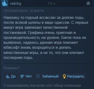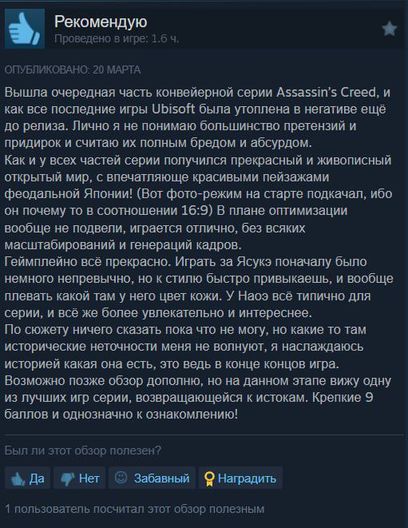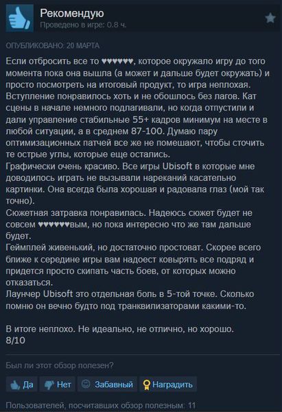 Игра получает достойные 8/10. Что выделяют:🔵Сочный визуал и добротный графон🔵К сюжету нареканий нет, он хорош🔵Бодрая боевка и живой геймплей, но простой — некоторым может быстро надоесть🔵Играть приятно за обоих персонажей🔵В игре есть каноничный режим без гейства🔵Из минусов: иногда хромает оптимизация и наличие говнолаунчера UbisoftИтог: весь хейт в сторону игры был не обоснован и часть может и правда спасти контору