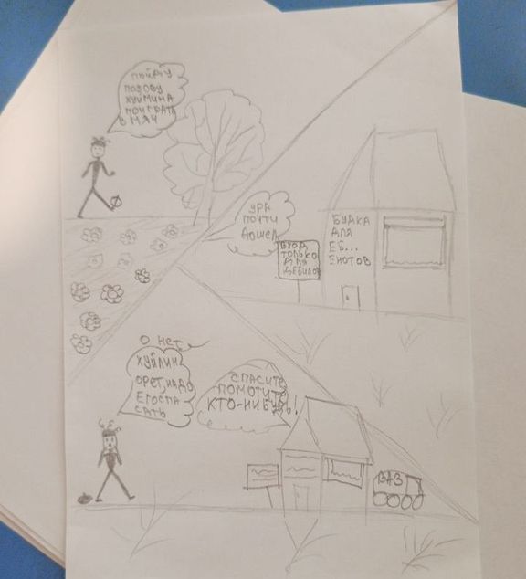 Решила я нарисовать мангу"Спасение Хуйлунга"Чмошник по имени Чмофан решил поиграть с другом , Хуйнунгом в мячПошёл к нему домой , но вот беда , Хйулунг не брал трубки, да и больше : не выходил на связь уже много днейНу и Чмофан решил пойти к нему самУслышав из дома Хуйлунга странные звуки помощи Чмофан отважно идёт его спасатьЧто произойдёт дальше ? Может Чмофан не успеет спасти друга ? А может.... Это вообще не Хуйлунг кричал , а его заложник...?