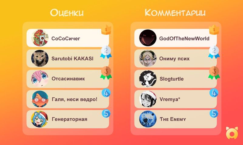 Друзья, завершился первый месяц тестирования нового обновления приложения Anixart, и мы с радостью делимся с вами статистикой канала Retro Anime. Благодаря вашему участию и поддержке этот месяц стал действительно незабываемым!«Спасибо PartyCorn за детальную статистику, которая помогла подвести итоги!»🏆 Лидеры по оценкам:1. CoCoСичег — ваши оценки вдохновляют всех!2. Sarutobi KAKASI — вы всегда на высоте!3. Отсасинавик — ваша активность невероятна!4. Галя, неси ведро! — спасибо за вклад!5. Генераторная — вы делаете наш канал ярче!💬 Лидеры по комментариям:1. GodOfTheNewWorld — ваши мысли — топливo для обсуждений!2. Ониму псих — энергия, которую вы приносите, бесценна!3. Slogturtle — благодарим за ваше мнение!4. Vremya✷ — ваши комментарии — украшение каждого обсуждения.5. Ƭʜᴇ Eɴᴇᴍʏ — вы помогаете делать сообщество живым!Этот успех — заслуга каждого из вас! Вместе мы создаем атмосферу, где каждый голос важен, а общение приносит радость. Мы искренне благодарны всем, кто ставил оценки, писал комментарии и делился впечатлениями.Ваша активность вдохновляет нас двигаться дальше. Вы — сердце канала Retro Anime, и без вас ничего бы этого не было.Продолжаем развиваться вместе! ❤#Anixart#BETA1#RetroAnime
