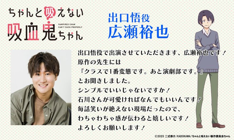 ✎ «Вампир не умеет правильно сосать» объявила дополнительный актёрский состав, в который вошли Кацуми Фукухара в роли Дайчи Чибы и Юя Хиросэ в роли Сатору Дегучи!