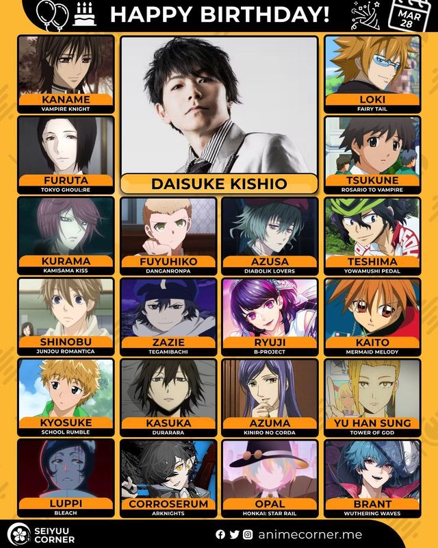 🥳 Сегодня день рождения у сэйю Дайсукэ Кисио🔻 Ему исполнилось 52 года! 🎉#ДеньРождения #28марта #ДайсукэКисио #сэйю30expand_more12expand_less
