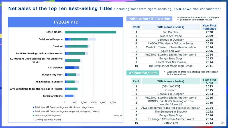 ✎ Kadokawa заработала более 130 миллионов долларов на своих тайтлах🔻 Самые продаваемые тайтлы студии Kadokawa, выпущенные и лицензированные с апреля по декабрь 2024 года, были раскрыты в обновленных результатах о доходах, включающих данные о чистых продажах за третий квартал (октябрь-декабрь) 6 февраля (через Gamebiz).🔻 Возглавляет список Kadokawa «Звёздное дитя» с более чем 5 миллиардами иен (~2.955.165.000 рублей). Kadokawa участвует в своей аниме-адаптации как член производственного комитета и как материнская компания своей дочерней студии по производству аниме Doga Kobo. С полным списком вы можете ознакомиться ниже.🔻 Самые продаваемые книги издательства Kadokawa (чистые продажи, апрель-декабрь 2024:▪ Звездное дитя: >5 млрд йен (~2.955.165.000 рублей);▪ Подземелье вкусностей: >3 миллиарда иен (~1.773.099.000 рублей);▪ Повелитель: >2.5 млрд иен (~1.477.582.500 рублей);▪ Re:Zero: Жизнь с нуля в другом мире: >2 млрд иен (~1.182.066.000. рублей);▪ Богиня благословляет этот прекрасный мир: >1.5 млдр иен (886.549.500 рублей);▪ Pan Dorobou: >1.5 млдр иен (886.549.500 рублей);▪ Великий из бродячих псов: >1.5 млдр иен (886.549.500 рублей);▪ Аля иногда кокетничает со мной по-русски: >1 млрд йен (591.033.000 рублей)▪ Мастера Меча Онлайн: >1 млрд иен (591.033.000 рублей).Всего: более 20 млрд иен ~(11.820.660.000 рублей).