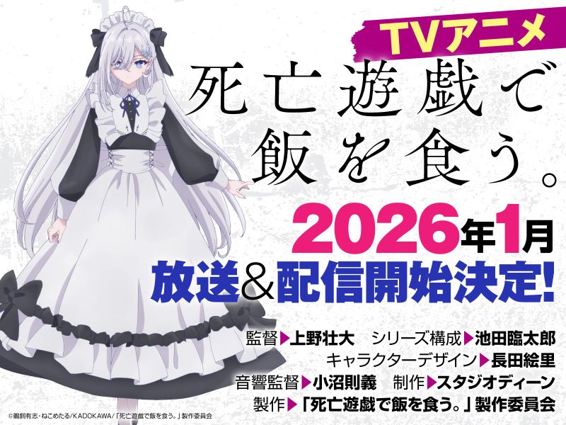 ✎ «Смертельная игра ради еды на столе» раскрывает студию, основной состав, дату выхода🔻 Аниме смертельная игра ради еды на столе раскрыло дату выхода на январь 2026 года, а также студию и основной состав. Сота Уэно руководит студией DEEN, Эри Осада выступает в качестве дизайнера персонажей, Ринтаро Икеда отвечает за композицию сериала, а Нориёси Конума выступает в качестве звукорежиссера. Ниже вы можете увидеть визуальное объявление.