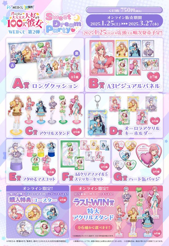 ✎ Коллаборация аниме «100 девушек», иллюстрации и информация о лотереи🔻 Продолжающаяся «Hyakkano Sweet Dream Party ♡» (Вечеринка сладких снов в Хяккано ♡) представляет девочек из семьи Рентаро в красочных и сложных пижамах. Лотерея, которая проходит совместно с аниме 100 девушек которые очень сильно тебя любят, и организованная совместно с D-Techno Co., Ltd., продлится до 27 марта.🔻 Лотерея «Hyakkano Sweet Dream Party ♡» даст фанатам шанс выиграть разнообразные товары, такие как бромиды, акриловые подставки и брелоки, прозрачные файлы и наклейки формата А4, жестяные значки, акриловые панели и очень большие акриловые подставки. Розничная цена лотерейных билетов составляет 750 иен (~ 480 рублей).