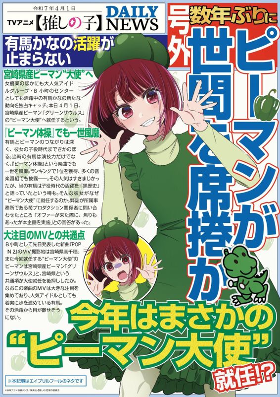 ✎ Кана Арима из «Звёздное дитя» становится «Послом болгарского перца» в шуточной иллюстрации газеты, которую нарисовала Канна Хираяма как первоапрельскую шутку!