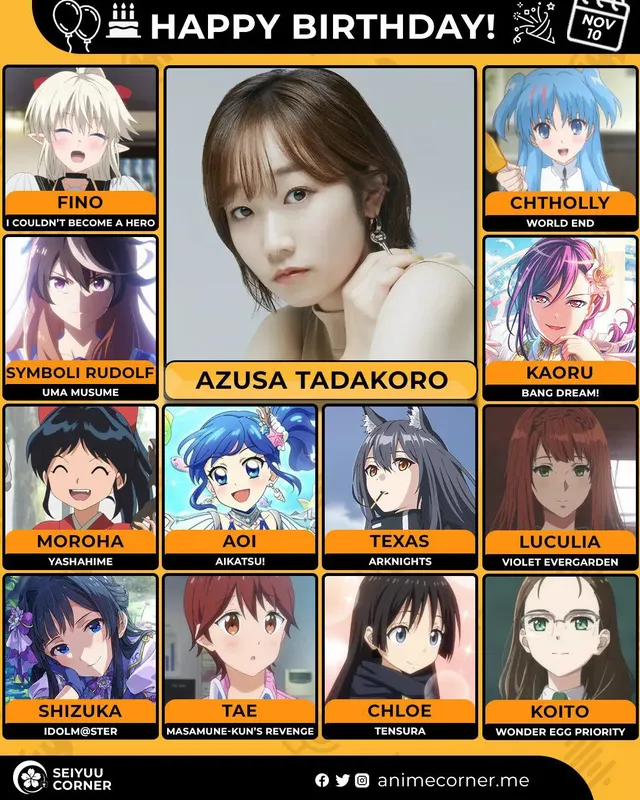 🥳 Сегодня день рождения у сэйю Адзуса Тадокоро🔻 Ей исполнилось 32 года! 🎉#ДеньРождения #10ноября #АдзусаТадокоро #сэйю10expand_more15expand_less