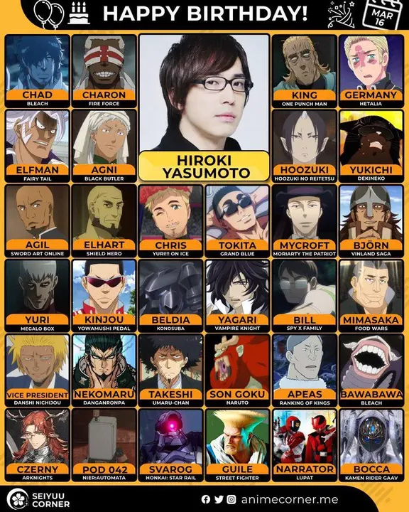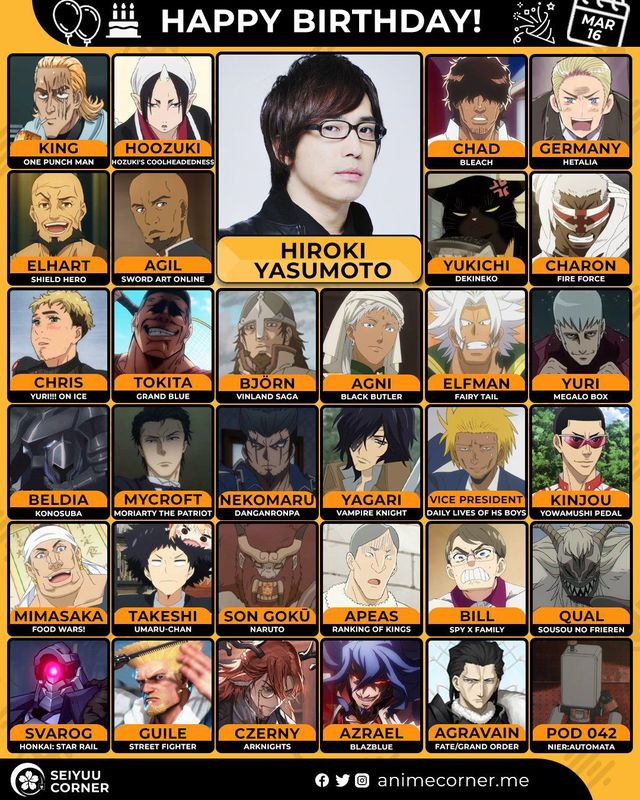 🥳 Сегодня день рождения у сэйю Хироки Ясумото🔻 Ему исполнилось 48 лет! 🎉#деньрождения #16марта #ХирокиЯсумото #сэйю30expand_more9expand_less