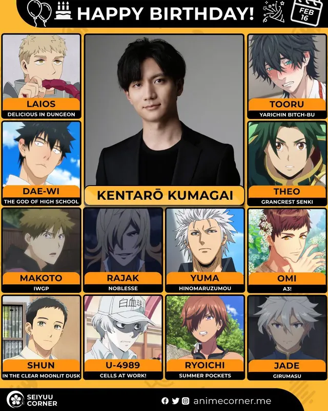 🥳 Сегодня день рождения у сэйю Кентаро Кумагай🔻 Ему исполнилось 32 года! 🎉#ДеньРождения #16февраля #КентароКумагай #сэйю20expand_more8expand_less