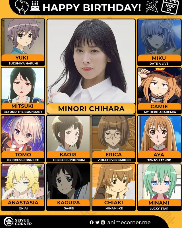 🥳 Сегодня день рождения у сэйю Минори Тихара🔻 Ей исполнилось 45 лет! 🎉#ДеньРождения #18ноября #МинориТихара #сэйю00expand_more13expand_less