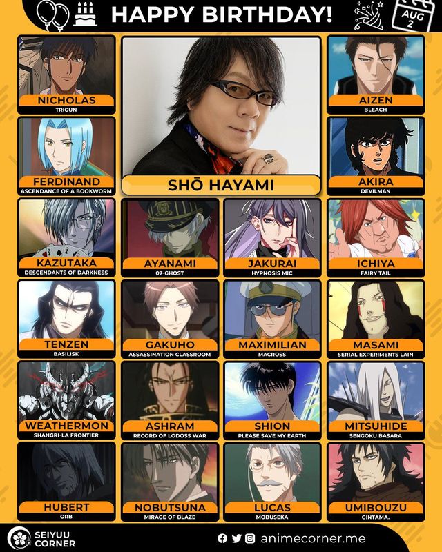 🥳 Сегодня день рождения у сэйю Сё Хаями🔻 Ему исполнилось 67 лет! 🎉#Деньрождения #2августа #СёХаями #сэйю30expand_more16expand_less