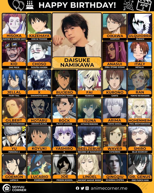 🥳 Сегодня день рождения у сэйю Дайсукэ Намикава🔻 Ему исполнилось 49 лет! 🎉#Деньрождения #2апреля #ДайсукэНамикава #Сэйю30expand_more15expand_less