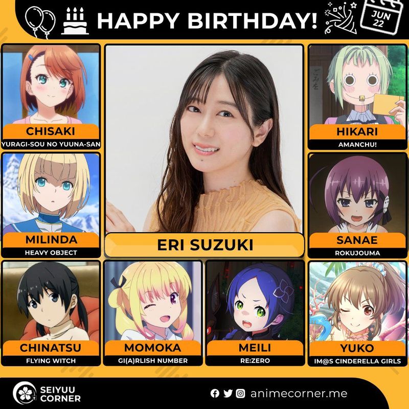 🥳 Сегодня день рождения у сэйю Эри Сузуки🔻 Ей исполнилось 33 года! 🎉#ДеньРождения #22июня #ЭриСузуки #сэйю60expand_more18expand_less