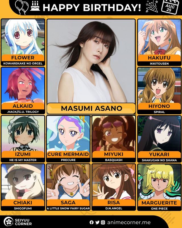 🥳 Сегодня день рождения у сэйю Масуми Асано🔻 Ей исполнилось 48 лет! 🎉#ДеньРождения #25августа #МасумиАсано #сэйю20expand_more14expand_less