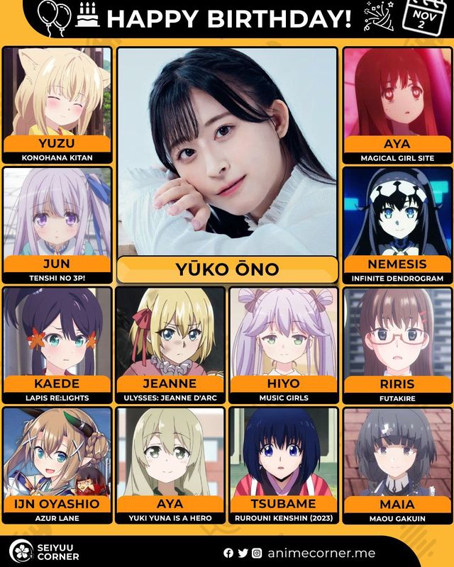 🥳 Сегодня день рождения у сэйю Юко Оно🔻 Ей исполнилось 28 лет! 🎉#ДеньРождения #2ноября #ЮкоОно #сэйю10expand_more16expand_less
