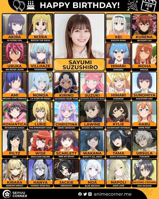 🥳 Сегодня день рождения у сэйю Саюми Судзусиро🔻 Ей исполнилось 28 лет! 🎉#Деньрождения #4февраля #СаюмиСудзусиро #Сэйю20expand_more15expand_less