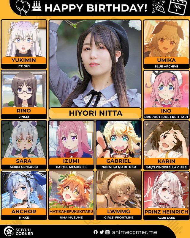 🥳 Сегодня день рождения у сэйю Хиёри Нитта🔻 Ей исполнилось 28 лет! 🌞#ДеньРождения #1июля #ХиёриНитта #сэйю20expand_more14expand_less