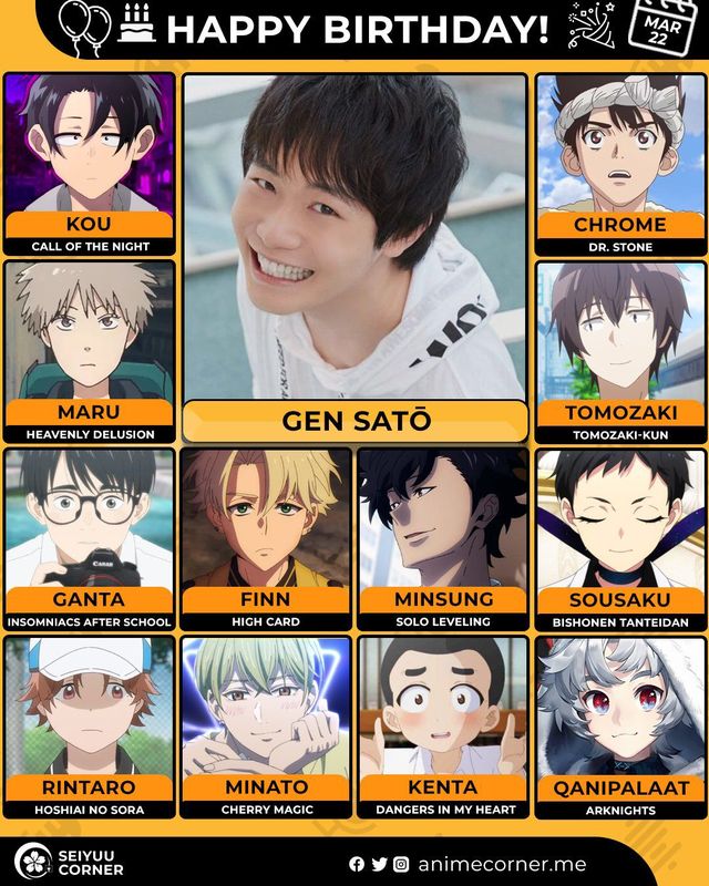 🥳 Сегодня день рождения у сэйю Гэн Сато🔻 Ему исполнилось 28 лет! 🎉#ДеньРождения #22марта #СатоГэн #сэйю00expand_more9expand_less