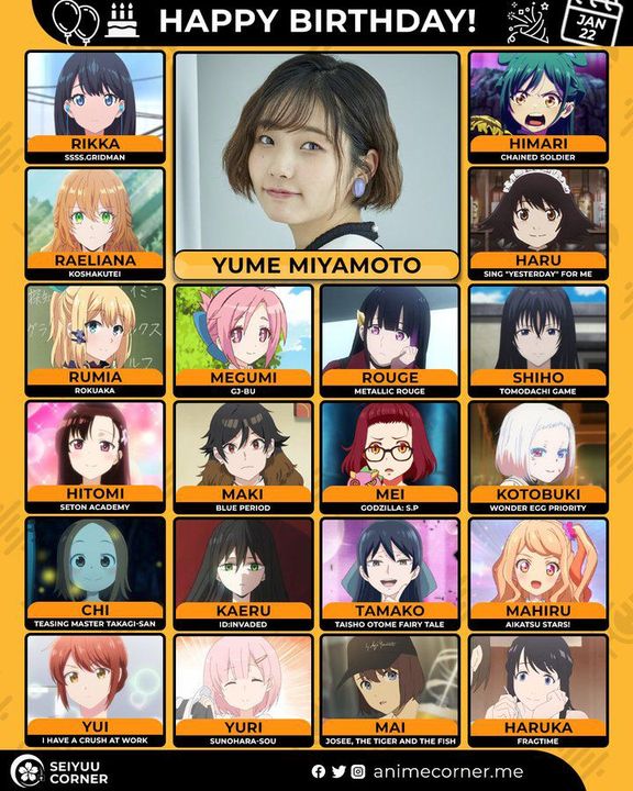 🥳 Сегодня день рождения у сэйю Юме Миямото🔻 Ей исполнилось 28 лет! 🎉#Деньрождения #22января #ЮмеМиямото10expand_more14expand_less