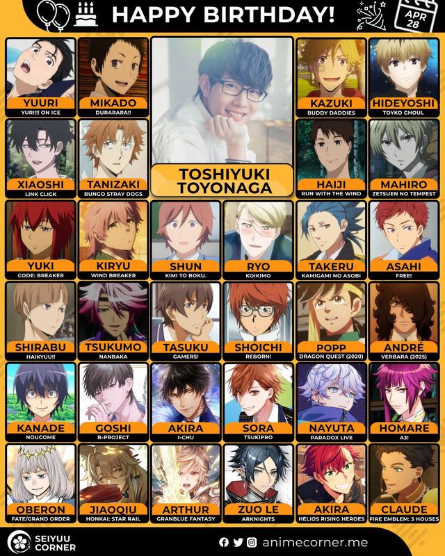 🥳 Сегодня день рождения у сэйю Тошиюки Тоёнага🔻 Ему исполнилось 41 год! 🎉#деньРождения #28апреля #ТошиюкиТоёнага #сэйю30expand_more14expand_less
