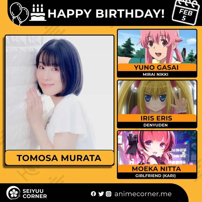 🥳 Сегодня день рождения у сэйю Томоса Мурата🔻 Ей исполнилось 45 лет! 🎉#ДеньРождения #5февраля #ТомосаМурата #сэйю60expand_more15expand_less