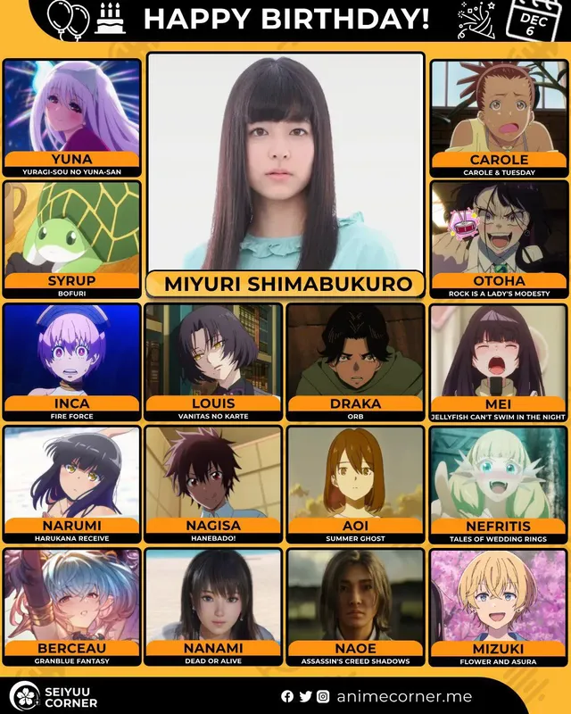 🥳 Сегодня день рождения у сэйю Миюри Симабукуро🔻 Ей исполнилось 31 год! 🎉#Деньрождения #6декабря #МиюриСимабукуро #сэйю10expand_more16expand_less