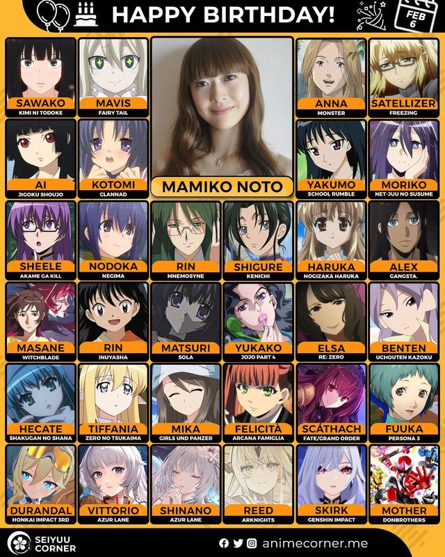 🥳 Сегодня день рождения у сэйю Мамико Ното🔻 Ей исполнилось 45 лет! 🎉#ДеньРождения #6февраля #МамикоНото #сэйю41expand_more16expand_less