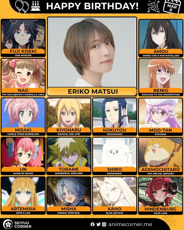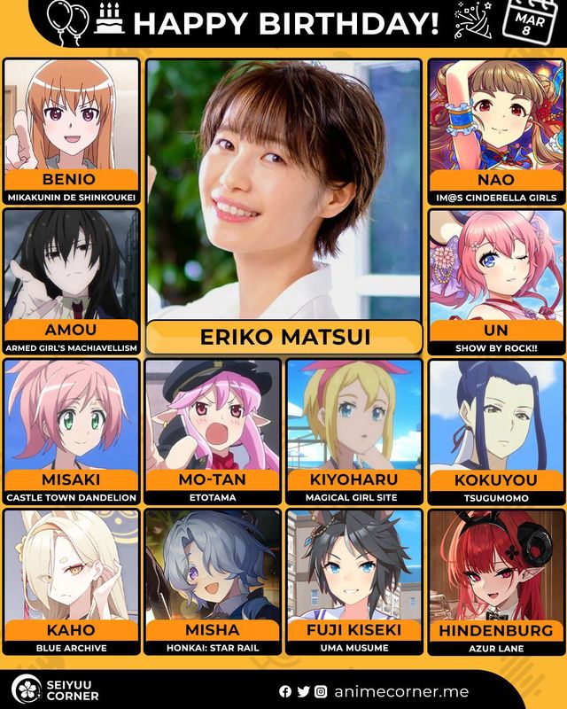 🥳 Сегодня день рождения у сэйю Эрико Мацуи🔻 Ей исполнилось 36 лет! 🎉#Деньрождения #8марта #ЭрикоМацуи #сэйю20expand_more8expand_less