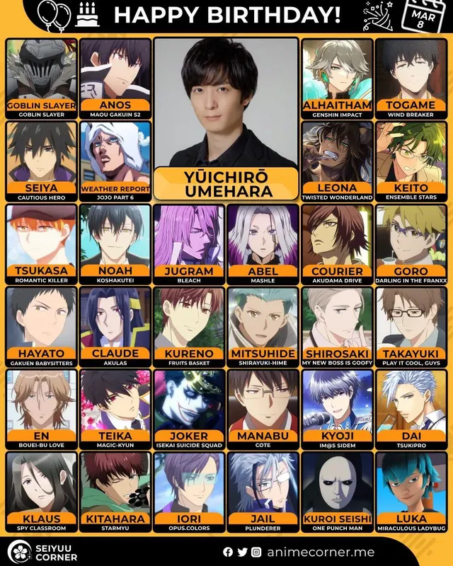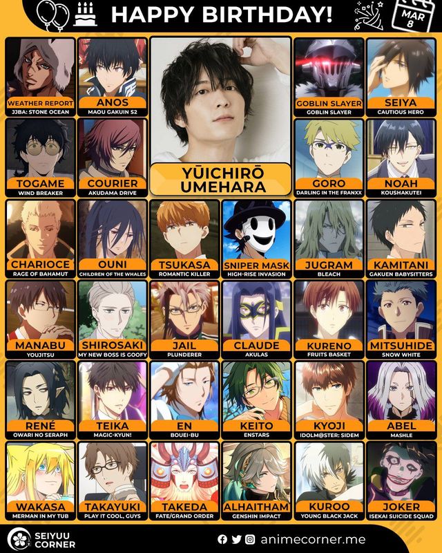 🥳 Сегодня день рождения у сэйю Юитиро Умэхара🔻 Ему исполнилось 34 года! 🎉#Деньрождения #8марта #ЮитироУмэхара #сэйю10expand_more8expand_less