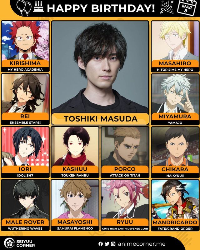 🥳 Сегодня день рождения у сэйю Тосики Масуда🔻 Ему исполнилось 36 лет! 🎉#ДеньРождения #8марта #ТосикиМасуда #сэйю50expand_more15expand_less