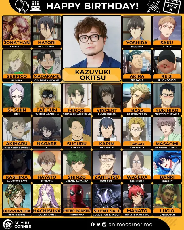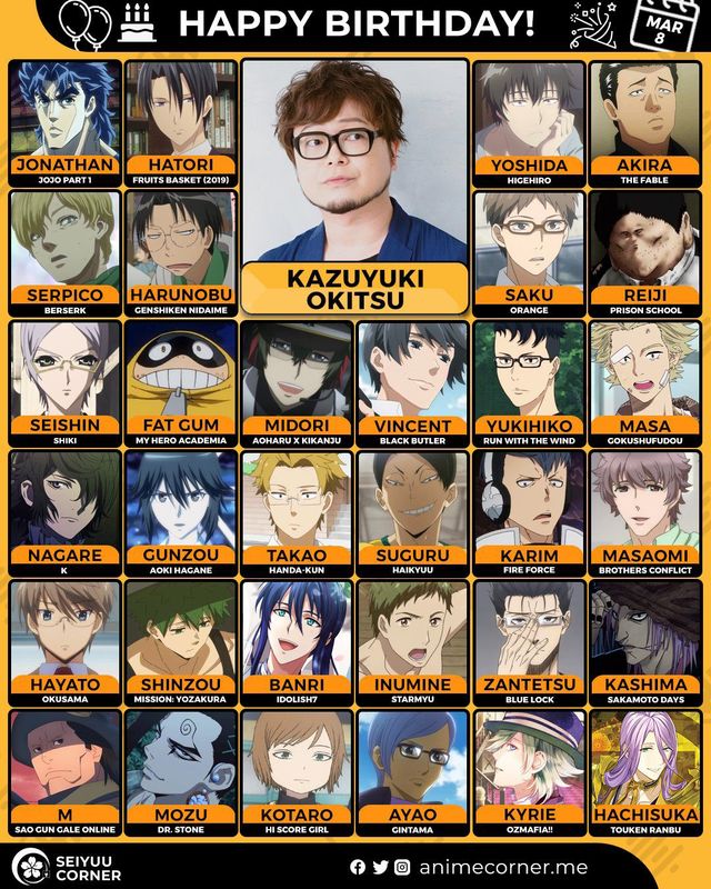 🥳 Сегодня день рождения у сэйю Кадзуюки Окицу🔻 Ему исполнилось 45 лет! 🎉#Деньрождения #8марта #КадзуюкиОкицу #сэйю10expand_more7expand_less
