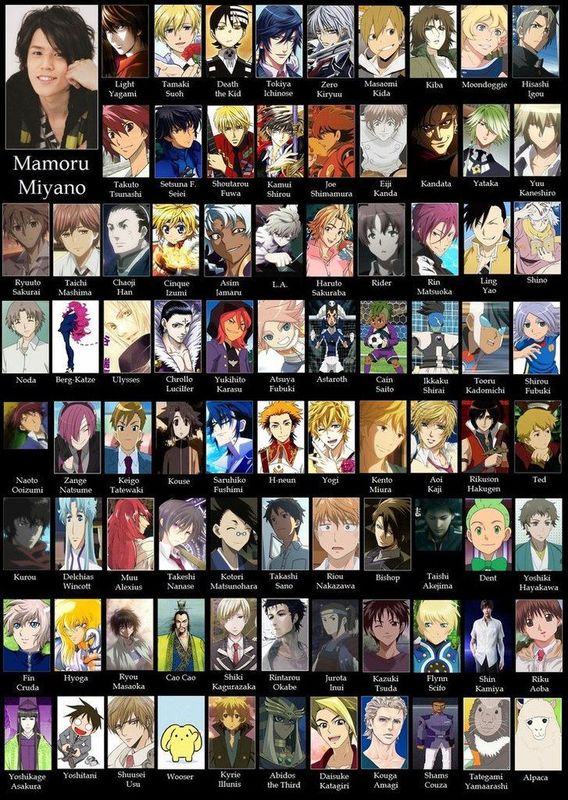 Некоторые из заметных ролей Мамору Мияно включают Лайта Ягами в Тетради смерти , Ринтаро Окабэ в Врата Штейна, Куроро Люцифера в Hunter x Hunter (2011) , Осаму Дазая в Великий из бродячих псов , Смерть Кида в Пожиратель душ и многие другие. Недавно он также был утвержден на роль Хикару Камики в Звёздное дитя .