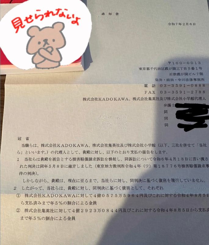 ✎ Самый известный пират манги в Японии раскрывает дерзкое объявление🔻 Хосино, оператор бывшего крупнейшего в Японии сайта пиратства манги Mangamura, опубликовал письмо, якобы отправленное от имени Kadokawa, Shueisha и Shogakukan. В нем он требует выплатить 1,7 млрд иен ущерба, который ему было приказано выплатить в прошлом году , что, по утверждению компаний, является крупнейшей суммой, когда-либо присужденной из-за пиратства манги. Вы можете ознакомиться с письмами и дополнительной информацией ниже.⠀ПОДРОБНОСТИ🔻 Требования письма, отправленного 6 февраля 2025 года, следующие: 405.755.964 иен (~243.998.752 рублей) Kadokawa плюс 5% годовых с 5 августа 2022 года, 429.230.844 иен Shueisha (~258.115.220 рублей) плюс 5% годовых с 5 августа 2022 года и 901.655.469 иен (~542.294.460 рублей) Shogakukan плюс 5% годовых с 5 августа 2022 года.Реагируя на письмо, Хосино ответил: «Наконец-то оно здесь, да? Я думал, это мошенничество с банковским переводом». Заработав в сети репутацию тролля, он ответил на пост X (ранее Twitter) с вопросом о том, что он планирует с этим делать, на что тот ответил: «Заблокируйте их и покончите с этим». Хосино давно дал понять, что не может заплатить штраф, заявив в последующем посте: «Только проценты составляют 86,5 миллионов иен в год. Даже если вы заплатите 240 000 иен в год, сумма компенсации все равно не уменьшится».