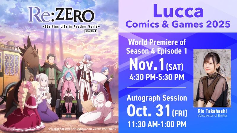 ✎ На мероприятии Lucca Comics & Games 2025 состоится мировая премьера первого эпизода «Re:Zero. Жизнь с нуля в альтернативном мире 4»! Показ состоится в кинотеатре «Астра» 1 ноября с 16:30 до 17:30 (время указано, предположительно, местное). В качестве гостя заявлена Риэ Такахаси (Эмилия)!