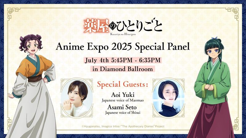 ✎ «Монолог фармацевта» появится на Anime Expo 2025🔻 Toho Animation объявили, что проведут специальную панель для «Монолог фармацевта» на Anime Expo 2025, которая пройдет с 3 по 6 июля. Японские актрисы озвучивания Аой Юки, которая озвучивает Маомао, и Асами Сэто, которая озвучивает Шисуи, будут присутствовать на панели в качестве специальных гостей.