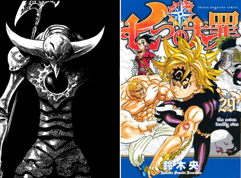 Персонаж слева, закованный в броню, напоминающую одновременно и классические рыцарские доспехи, и нечто более зловещее, демоническое — это, скорее всего, один из Святых Рыцарей, возможно, даже кто-то из Десяти Заповедей. Рога, массивная секира, необычные узоры на броне – всё это создает образ могущественного и, вероятно, антагонистичного воина.Обратите внимание на контраст между этим изображением и обложкой тома справа. Яркие цвета, динамичные позы главных героев (Мелиодаса и, вероятно, Эсканора) — это уже совсем другая сторона истории. Мы видим и символ дракона на руке Мелиодаса, и намёк на силу Эсканора. Этот контраст отлично передает двойственность мира "Семи Смертных Грехов", где тьма и свет постоянно борются.