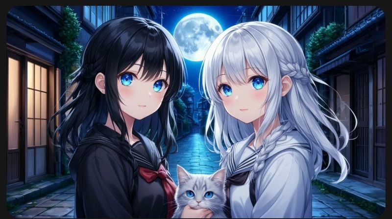 — Хорошо сегодня поработали. Етсу, ты сегодня молодец. - Проговорила Рика, закрывая дверь кафейни. Етсу вилась вокруг, разглядывая причудливые тени, что бросали неоновые вывески и редкие прохожие и неведомые гости из иных миров. Закрыв дверь девушки завернули за угол...И вот этой прекрасной ночью они стали свидетельницами странного явления. Прямо из тени переулка сверкнули 2 громадных ярких глаза...Ночь клубилась вокруг, как густой, черный кофе, а в центре этой черноты сиял он – Лунный синий кот. Его шерсть мерцала, словно осколки звезд, а глаза светились мудростью древних галактик.— Посмотри, Рика, он словно соткан из самой ночи, – прошептала Етсу, её голос был наполнен трепетом, как будто она увидела комету, упавшую с небес.Кот, будто бы понимая её слова, грациозно спрыгнул с мусорного бака и, изящно перебирая лапками, направился к ним.Его шерсть мерцала оттенками сапфира, а глаза горели, как крошечные сверхновые. — Лунный Синий, - прошептала Рика, зачарованная - невероятно...Етсу уже протягивала руку, боясь спугнуть это чудо. Кот, будто понимая их добрые намерения, подошел ближе и потерся о ноги Етсу.— Назовём его Аой! - предложила Етсу, её голос был нежнее шёлка. - Аои, имя, что значит "синий" на японском.— С именем решим потом... - пробормотала Рика, протягивая руки к пушистой шерстке её нового знакомого. - Какой он милый!— Мяу - позволил себя погладить кот🐈