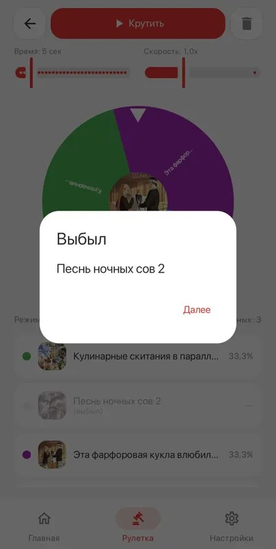 Выбираю с помощью рулетки, какой тайтл буду смотреть следующим 🎲Если честно, хочется какой-нибудь романтики из запланированного. «Песнь ночных сов» по сравнению с первым сезоном ощущается душновато, так что надеюсь, рулетка дропнет что-нибудь другое. Показать ещё