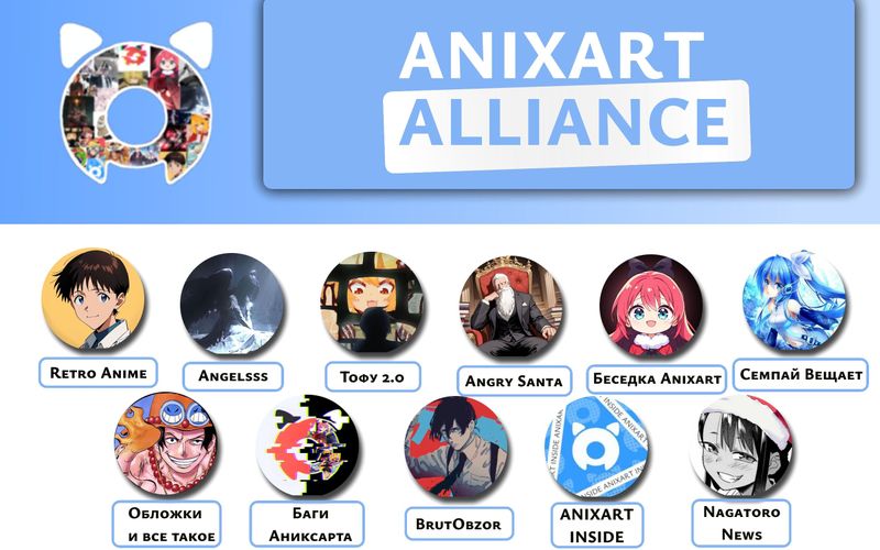 Retro Anime - великолепные арты и кадры из старых аниме и не только вы найдёте только у негоAngelsss - он пока неактивен, но обещал всех снова радовать своими постамиТофу ❦ 2.0 - самые красивые тянкиAngry Santa - самый высокоинтеллектуальный каналБеседка Anixart - канал где каждый админСемпай Вещает - обзоры на аниме и прочееОбложки и всё такое - собственноручно качественные Обложки для васБаги Аниксарта - лучший канал о нашем любимом Аниксарте, где ищут и исправляют недостаткиBrutObzor - лучшие обзоры на анимеANIXART INSIDE - всё об обновлении и прочие ништякиNagatoro News - Дни Рождения аниме персонажей и качественный контент на протяжении 24 часов каждый день❤ Вступление в ряды Альянса:Если заинтересовало и хотите вступить то пишите в ТГ @oruel3211 мы рады всем