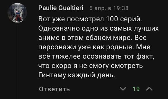 И сегодня последний обзор по старому списку, завтра начнётся новый список из набора. Но сегодня закрывает список аниме Гинтама.Сюжет аниме: Жить в феодальной Японии непросто... особенно если вас завоевали инопланетяне. Да, конечно, новая система здравоохранения хороша, но запрет на ношение меча ставит истинных самураев в безвыходное положение. Вдвойне это относится к Гинтоки Сакате, последнему самураю, в ком ещё жив истинно японский дух.Гинтоки живёт с Кагурой, представительницей одной из сильнейших рас во вселенной, и очкариком Шинпачи Шимурой. Втроём они создают агентство под названием «Мастера на все руки Гинтоки-сана» и берутся за любые странные и нелепые поручения, с которыми к ним приходят, будь то поиск пропавшей кошки или спасение мира.