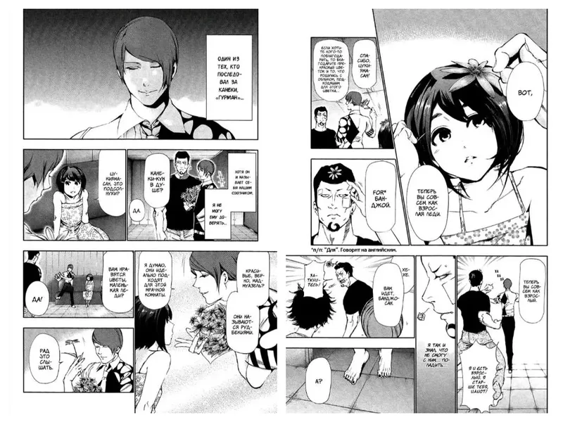 Радует, что после глав в Токийском гуле автор добавляет всякие интересные взаимодействия между персонажами. Один из таких монолог в виде "чата", и больше всего мне он понравился между Цукиямой Шу и Хинами. Довольно миленько 🙃