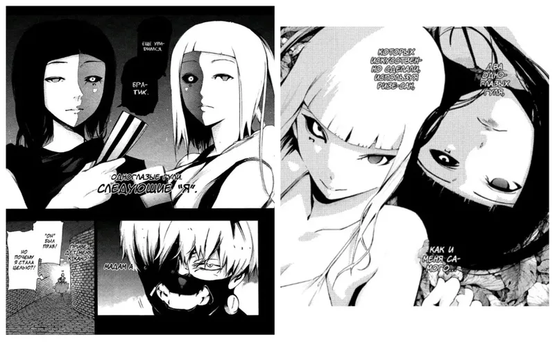 Ну а док, пересадивший органы гуля (какухо их называют) в Канеки, прожолжает свои злодеяния. И на свет двух сестричек-полугулёнушей породилПлюс в мою коллекцию милашек из данного тайтла