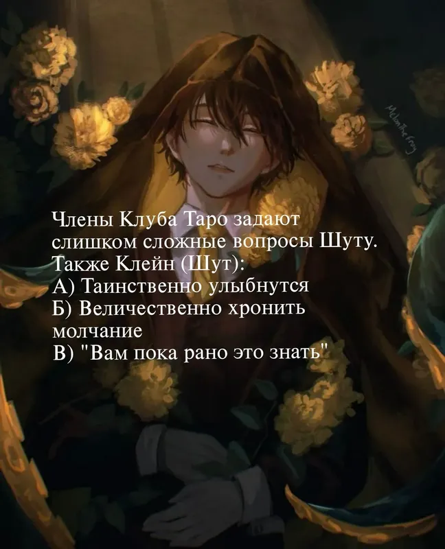 Кем притворялся главный герой Повелителя Тайн — Чжоу Минруй?Клейн Моретти — бывший ученик Хойского университета Тингена (был перенесен насильно)Безымянный — обычный любитель мистики (маскировка для добычи информации из клуба потусторонних)Шерлок Мориарти — частный детектив Баклунда (для временного скрытия от Ночных Ястребов и Зангвила)Стейтем — репортёр газеты в Баклунде (использовался для маскировки и вхождение в доверие)Мистер Шут — образ абсолютного божества (создан для влияния на Клуба Таро)Клоун — образ Клейна для того чтобы проститься с Мелисой и Бенсоном(просто короткий образ, для выполнения своего желания)Мистер Мир — участник клуба Таро (на самом деле пустая оболочка в руках Клейна)🎩Информация неполная, позже сделаю репост и дополню.
