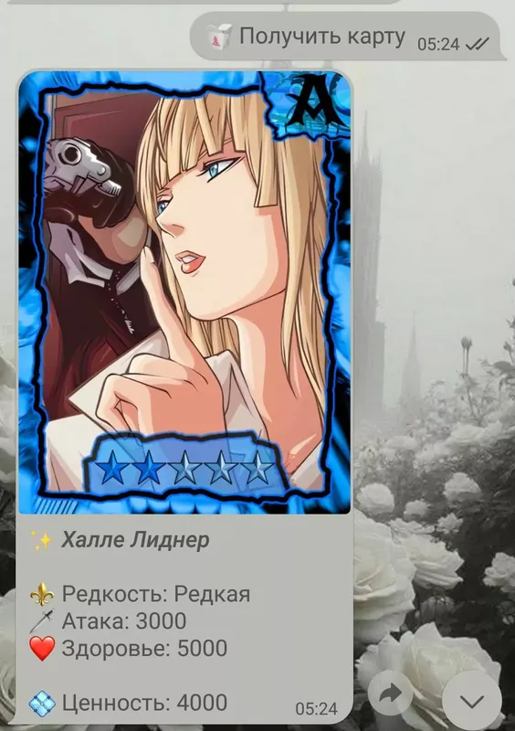 Вам выпало : Халле ЛиднерВселенная : Тетрадь смертиРедкость : РедкаяАтака : 3000 ; Здоровье : 5000 ; Ценность : 4000Характеристика персонажа на карте : Халле Лиднер (настоящее имя — Халле Баллок) — персонаж аниме и манги «Тетрадь смерти», член «Союза против Киры» (СПК).Личность : Сдержаная, строгая и ответственная. Является интровертом, переживает чувства и эмоции внутри себя.Целеустремлённая, не любит менять планы. Готова пожертвовать собой ради собственной цели.Острый, проницательный ум. Знает, когда стоит подчиниться приказу начальства или действовать самостоятельно.Иногда бывает привязчива к людям, но её показной холод заставляет людей соблюдать дистанцию. Может довериться полностью только хорошо знакомым людям, которые не связаны с работой.Достижения : Лиднер выполняет роль прилежного телохранителя, скрывая попытку раскрыть связь между Такадой и Кирой.Халле Лиднер получила признание за свой интеллект, стратегическое мышление и сложный характер. Её считают одним из самых умных персонажей серии.Она единственная женщина-член организации, присоединилась к СПК, чтобы отомстить за близкого знакомого, который был убит Киосуке Хигучи в то время, когда он выступал в роли Киры