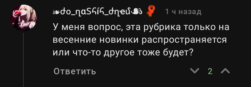 -Нет, будут и другие тайтлы. В данный момент я активно изучаю весенние релизы, не так уж и много качественных получилосьПользователь: арт.ме