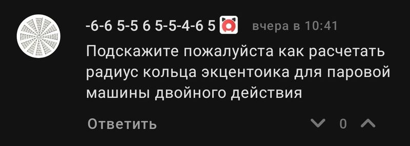 Формула для расчёта радиуса кольца эксцентрика примерно следующая:R = H / 2R — радиус кольца эксцентрика (эксцентриситет),H — ход поршня.Если нужны более точные формулы, можно использовать уравнения, связывающие угол поворота, смещение и длину шатуна:x = R cos(θ) + l cos(φ)где θ — угол поворота эксцентрика,φ — угол шатуна.Еще в предложенных записях я нашел вот такую вот вкусняшку: