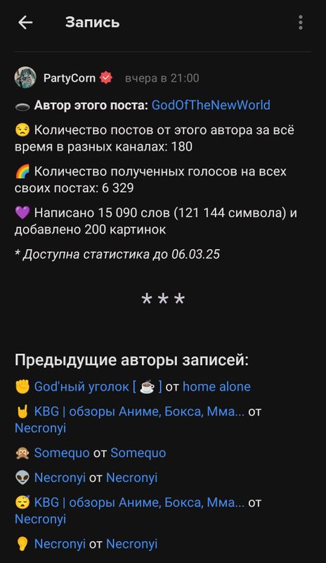 🪄 Большое спасибо пользователю PartyCorn за его старания и вклад в развитие данного приложения!🤔 Как добиться такого результата?1 ] Выкладываем пост на свой канал2 ] Сразу же переходим в профиль к пользователю PartyCorn3 ] Пролистываем чуть ниже и "вуаля"! Ваша стата.Удачного теста! upd. Кстати, у меня появился второй канал.Буду премного благодарен, если подпишитесь:📌 Вот ссылочка: 👉🏻 НАЖМИ НА МЕНЯ 👈🏻📌 Вот ссылочка: 👉🏻 НАЖМИ НА МЕНЯ 👈🏻📌 Вот ссылочка: 👉🏻 НАЖМИ НА МЕНЯ 👈🏻upd2. Напомню, что вы можете добавлять мои личные хэштеги на любую публикацию ( так я смогу обязательно её заметить )= Эти хэштеги: #GodOfTheNewWorld #Goddik🔢 Актуальная информация на [ 10.03.2025 ]:• Постов в хэштегом #GodOfTheNewWorld – 482• Постов с хэштегом #Goddik – 2837.
