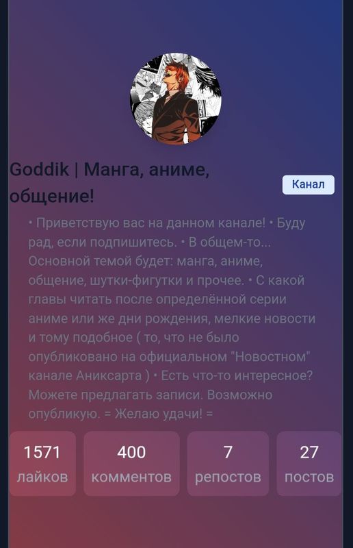 📌 Приветствую вас на данном канале! • Буду рад, если подпишитесь. • В общем-то... Основной темой будет: манга, аниме, общение, шутки-фигутки и прочее. • С какой главы читать после определённой серии аниме или же дни рождения, мелкие новости и тому подобное ( то, что не было опубликовано на официальном "Новостном" канале Аниксарта ) • Есть что-то интересное? Можете предлагать записи. Возможно опубликую. = Желаю удачи! = 🔵 Админ канала: GodOfTheNewWorld ( https://anixartapp.com/prof... )